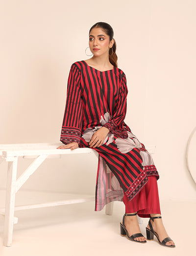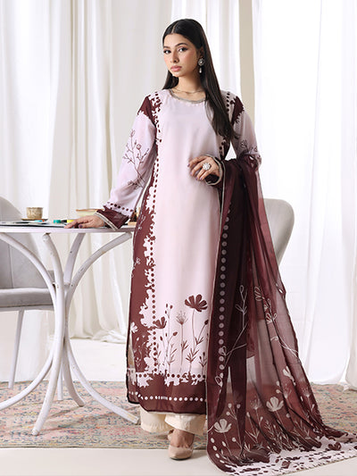 It is a luxurious three-piece silk outfit featuring a stunning two-tone digital print in maroon...