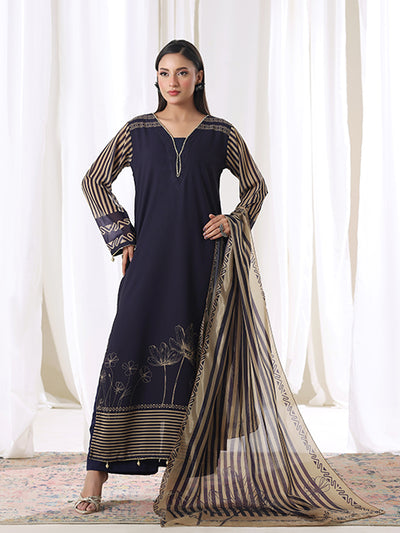 A deep navy blue long shirt (Kameez) defined by its bold, contrasting tan-colored striped sleeves....
