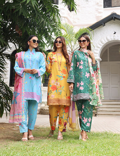This a captivating three-piece dress crafted from premium silk fabric, adorned with a vibrant Susi...