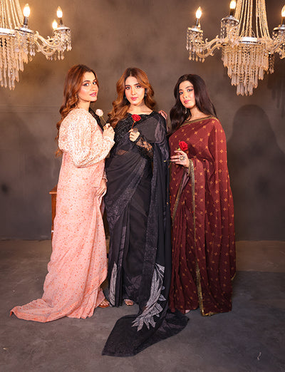 This enchanting printed chiffon saree cascades effortlessly, its feather-light fabric creating a dreamy, fluid drape....