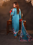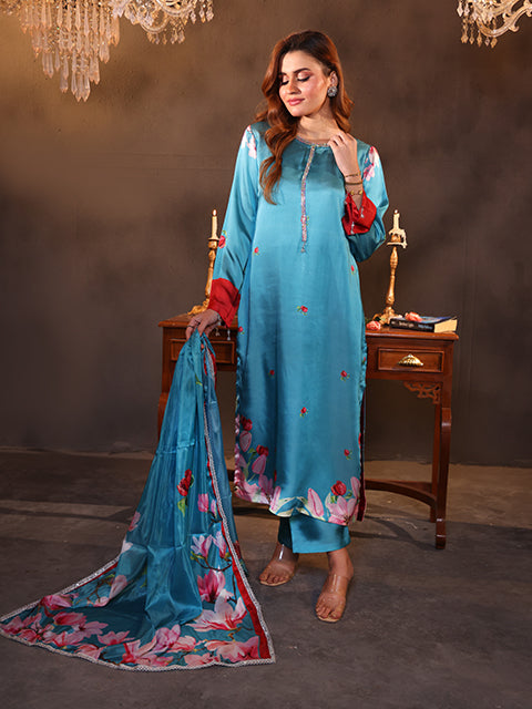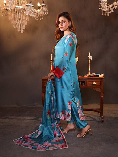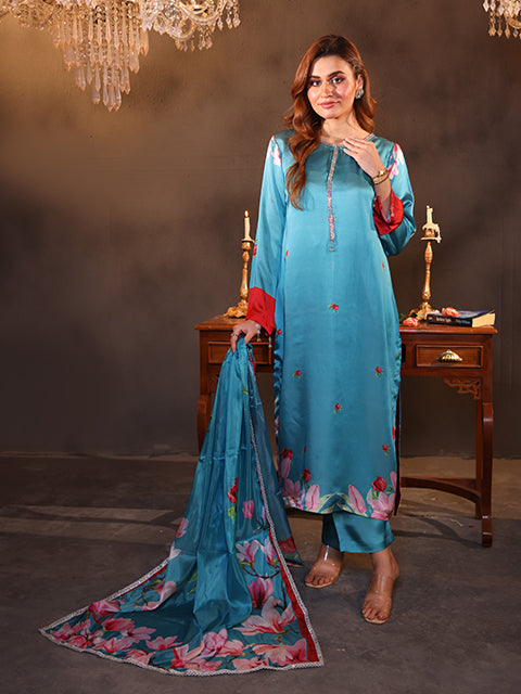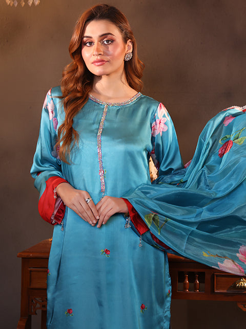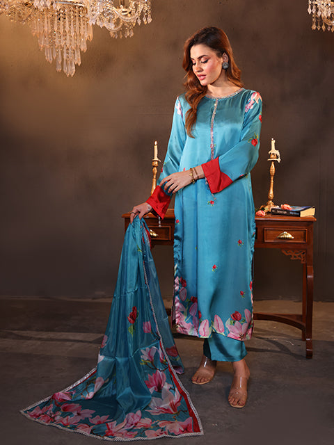 A beautifully crafted three-piece ensemble in a serene aqua-blue shade, adorned with delicate floral motifs. The long shirt features subtle accents and contrasting deep red cuffs for a refined pop of color. Paired with matching trousers and a flowy, printed dupatta, this outfit blends grace and sophistication—perfect for daytime festivities or evening gatherings.