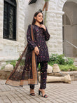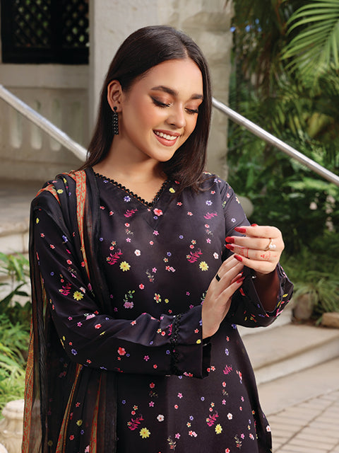 Presenting Felicity: Swiss Lawn with a black base, overall floral print, lace on the shirt border, cuffs, and neckline, and a soft silk dupatta with similar floral print and brown borders. Perfect for a sophisticated and elegant look!