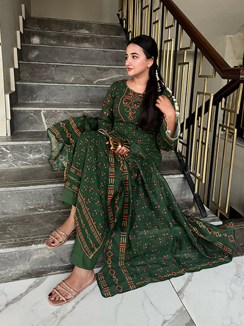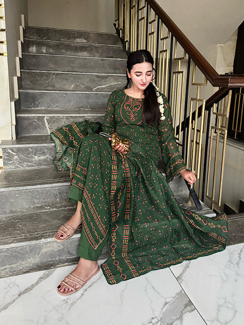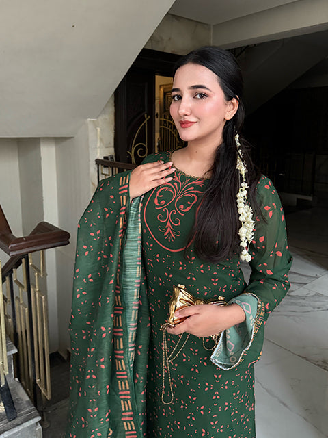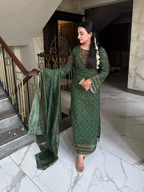 This elegant long shirt dress in a refreshing green hue embodies timeless grace and modern sophistication. Crafted from premium fabric, the shirt features a flowing silhouette that drapes beautifully, enhancing both comfort and style. Delicate embroidery and subtle detailing add a refined charm, while the matching trouser ensures a sleek and polished look. Paired with a lightweight dupatta that completes the ensemble, this outfit is perfect for semi-formal gatherings, festive occasions, or daytime celebrations. The serene green tone symbolizes freshness