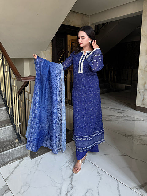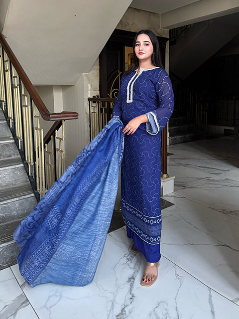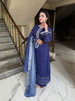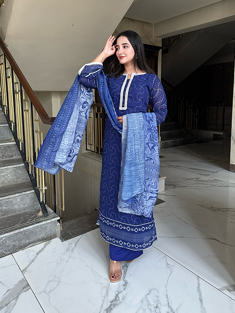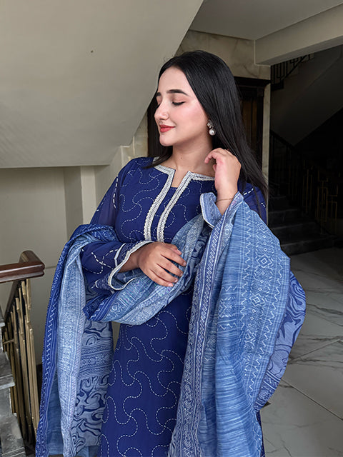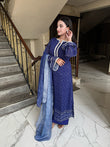 Immerse yourself in timeless elegance with this stunning blue three-piece ensemble. The outfit features a gracefully tailored long shirt paired with matching trousers, creating a sleek and sophisticated silhouette. A delicately draped dupatta completes the look, adding a touch of charm and femininity. The serene blue hue radiates calm sophistication, making it perfect for both festive occasions and elegant gatherings.