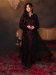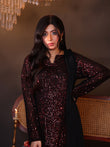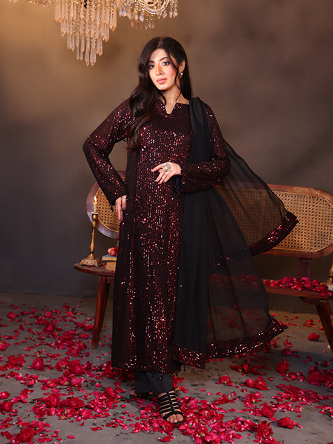 A stunning maroon sequin-embellished dress paired with a sheer black dupatta, crafted to add effortless glamour to any occasion. Its shimmering details, elegant silhouette, and chic styling make it the perfect choice for festive nights and formal events.