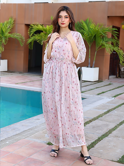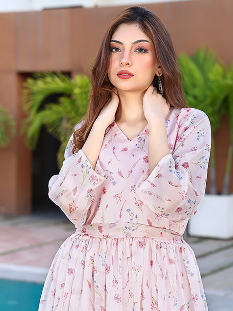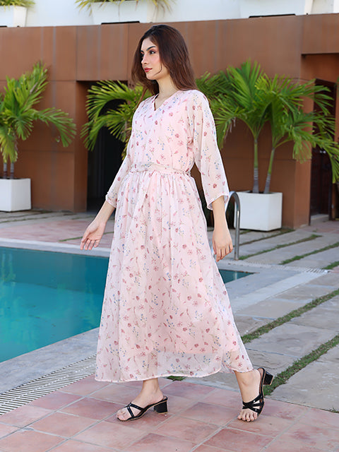 V-neck maxi frock with a defined waistline and ruffled hem, giving both structure and flow