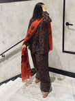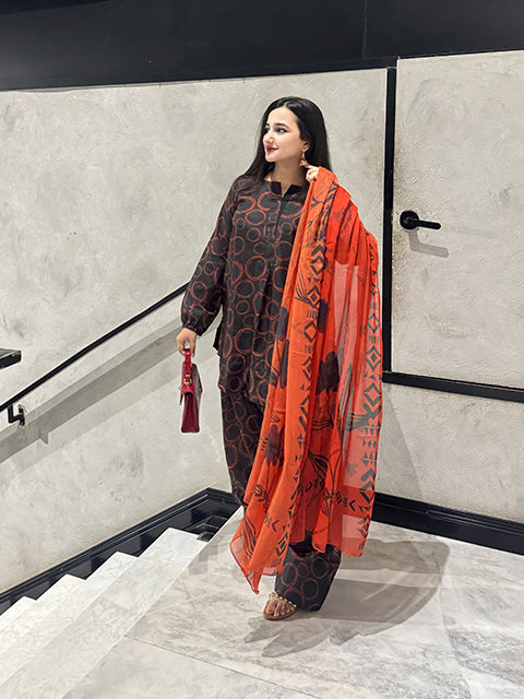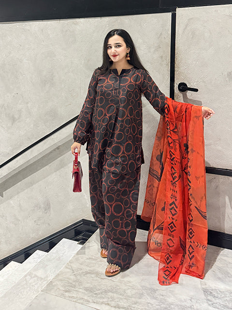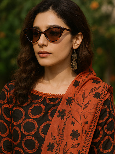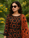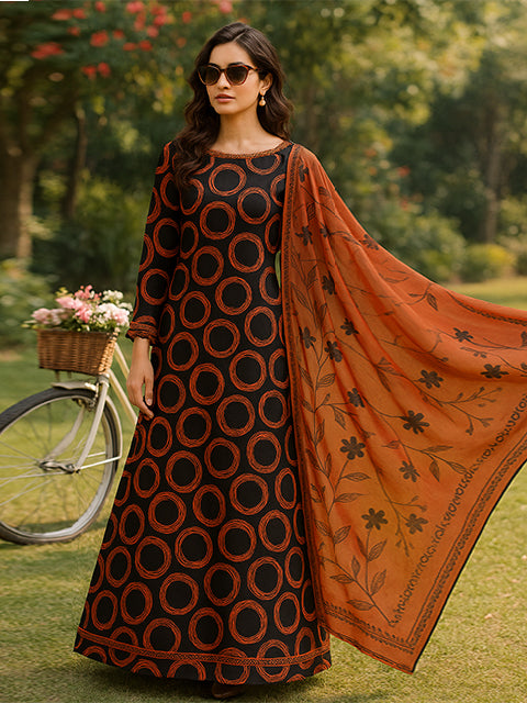 The deep black base adorned with rhythmic rust-orange circle patterns, paired with the floral-printed dupatta, creates a perfect blend of tradition and modern flair—like a daydream.
