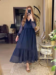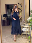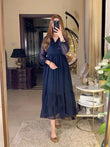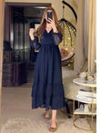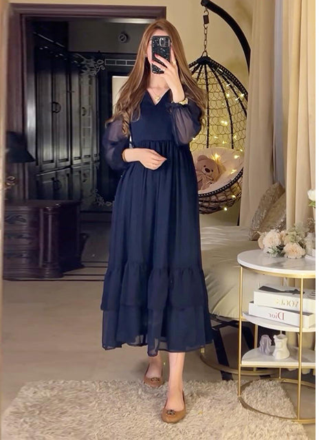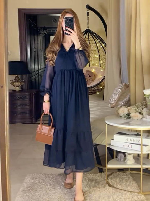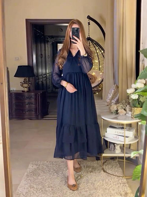 A graceful navy-blue chiffon dress featuring a soft flowy silhouette with tiered detailing and sheer sleeves. Its lightweight drape and effortless elegance make it perfect for casual outings, dinners, and everyday chic styling.