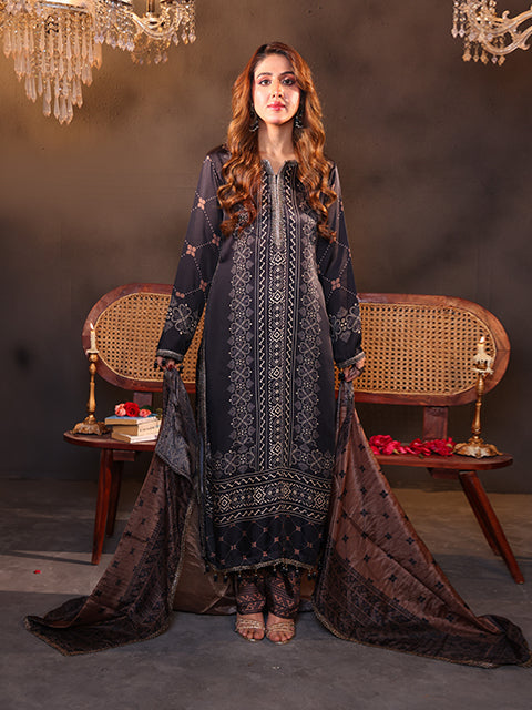 It is a striking three-piece black silk outfit featuring an elegant brown and copper print....