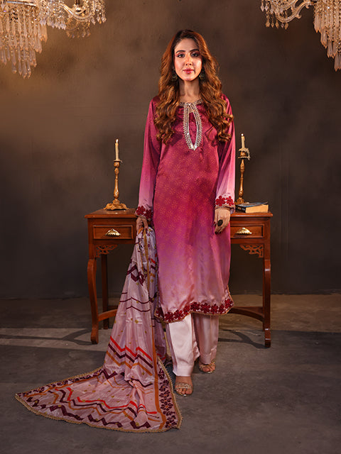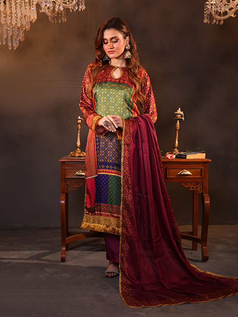 It is a luxurious three-piece silk outfit featuring a stunning two-tone digital print in maroon...