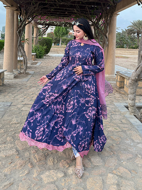 This stunning navy-blue frock-style dress is adorned with striking pink floral patterns, creating an enchanting contrast that radiates elegance. The flowing silhouette enhances grace and movement, while the soft pink dupatta with delicate edging adds a touch of feminine charm.