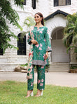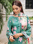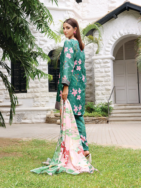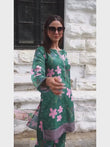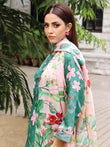 Step into Aurora: Swiss Lawn with a green base and pink floral print, multicolored printed shirt border, and a soft silk pink dupatta with green flowers. Perfect for a fresh and lively look!