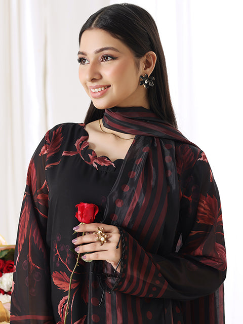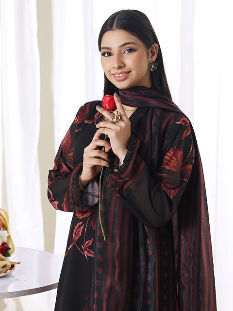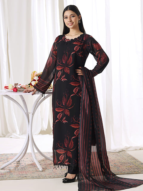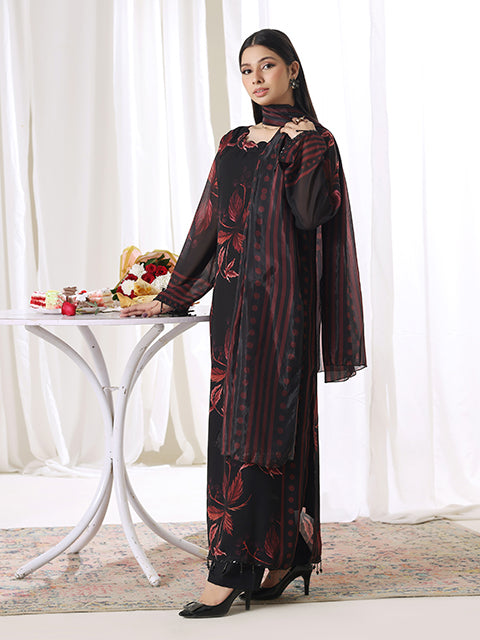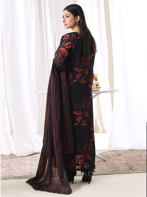 A sophisticated black outfit dominated by large, rust-colored leaf prints that evoke an autumnal feel. The neckline features a unique scalloped edge, and the sleeves are finished with delicate bead-work or tassels at the cuffs. The dupatta features a mix of broad stripes and leaf patterns, tying the warm-toned look together perfectly.