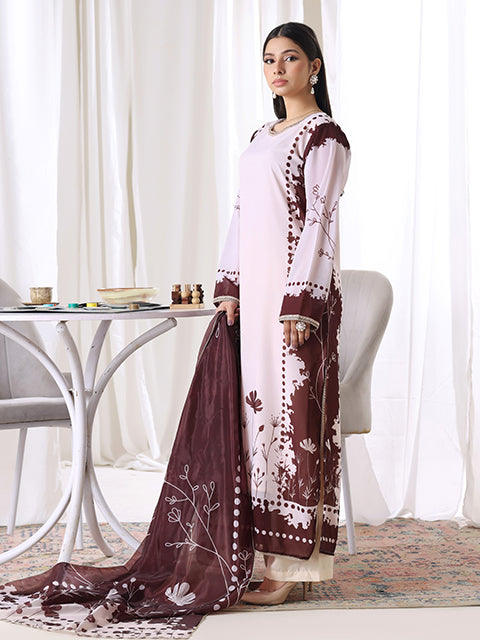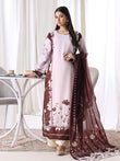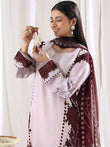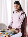 This ensemble plays with soft and bold tones, featuring a pale pink/lilac base framed by deep burgundy borders. The intricate floral patterns on the sleeves and the lower half of the shirt are complemented by a "polka-dot" style border, giving it a playful yet traditional look. The dupatta is a rich burgundy with lighter floral accents.