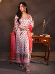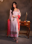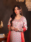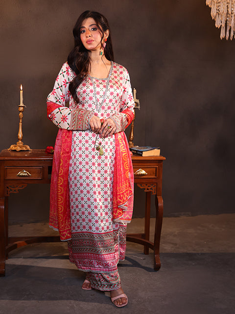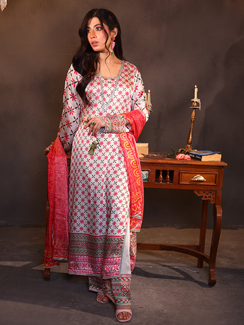 It is timeless three-piece silk outfit featuring a classic pink and white traditional print. The luxurious fabric is adorned with intricate embroidery and heavy lace detailing, adding a touch of opulence. Paired with tailored trousers and a beautifully embellished dupatta, this ensemble exudes grace and sophistication for any special occasion.