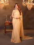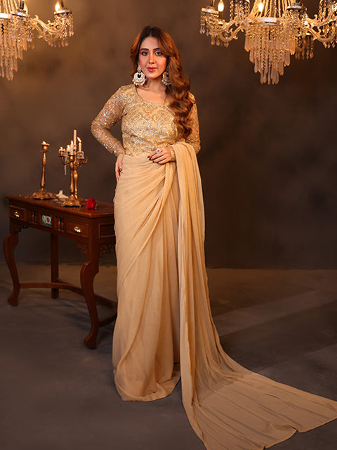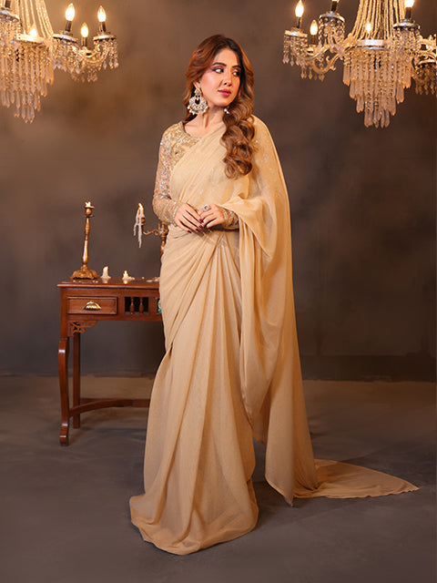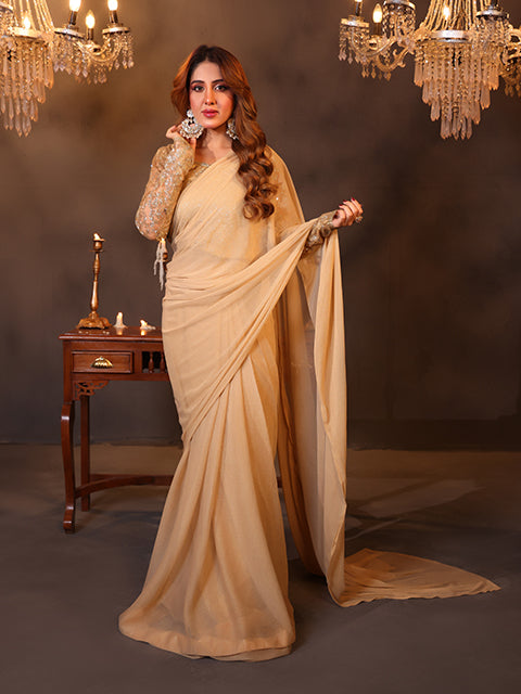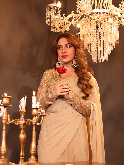 This mesmerizing camel-colored net saree, crafted from an ultra-soft and feather-light fabric, flows effortlessly with every movement. Its sheer, airy texture creates an ethereal silhouette, radiating understated elegance. Paired with a delicately embroidered blouse, adorned with intricate detailing, it strikes a perfect balance between subtle luxury and timeless grace.