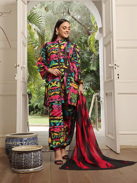 Discover Ebullience. Swiss Lawn with a black base, rich colorful textures, and a soft silk dupatta with black and red scattered designs. Perfect for a vibrant summer look!