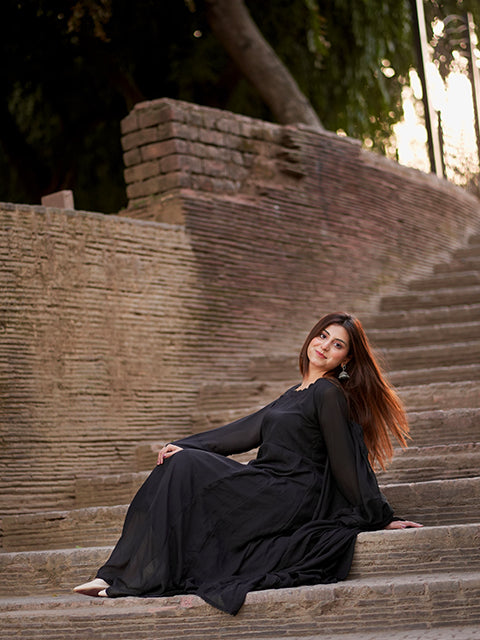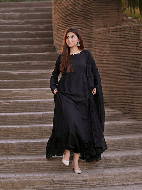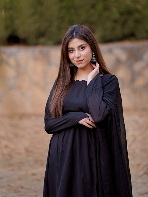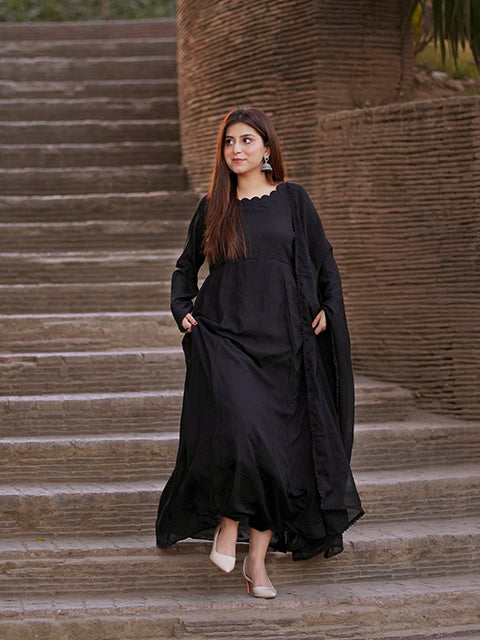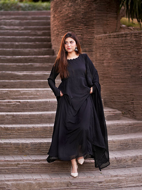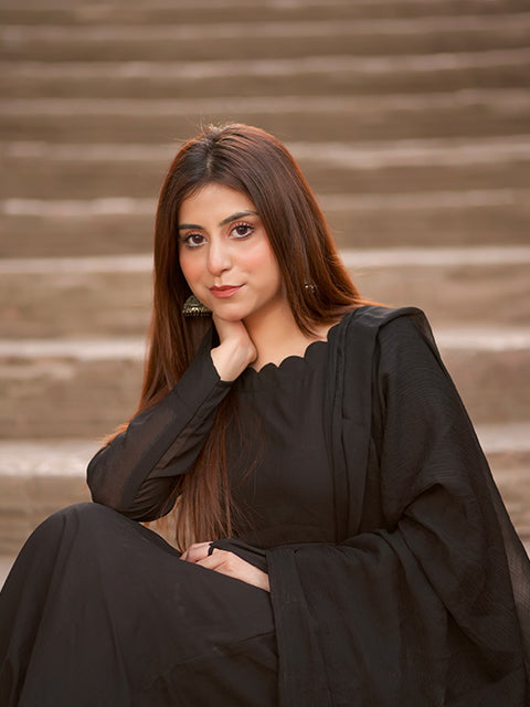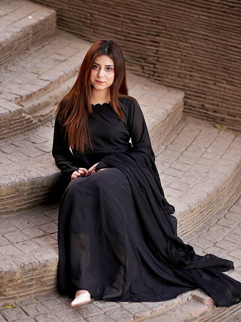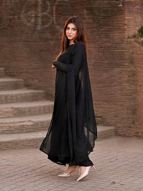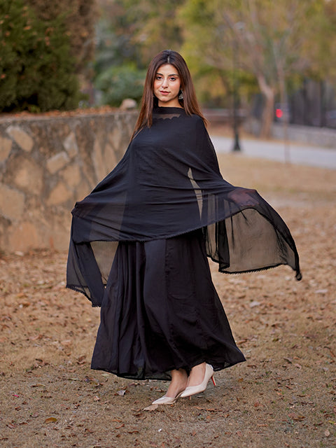 Experience the refreshing Eclipse Noir with this stunning neckline. The black canvas on chiffon fabric creates a timeless look, enhanced by details on the neck. Delicate lace on dupatta adds a touch of elegance. It is paired with a crepe bottoms and an chiffon dupatta. Shirt Fabric: Chiffon ( Length: 50 Inches )