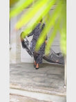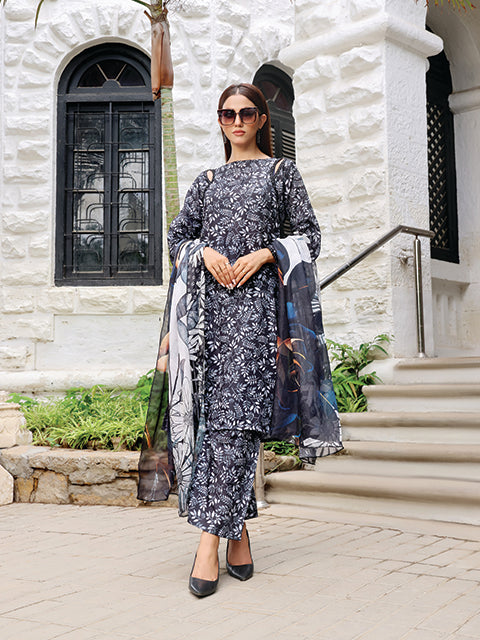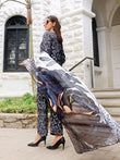 Unveil Effervescent: Swiss Lawn with an overall black and grey print, lacey shoulder cuts, and a soft silk dupatta with big flowers. Ideal for a bold and elegant outfit!