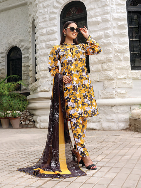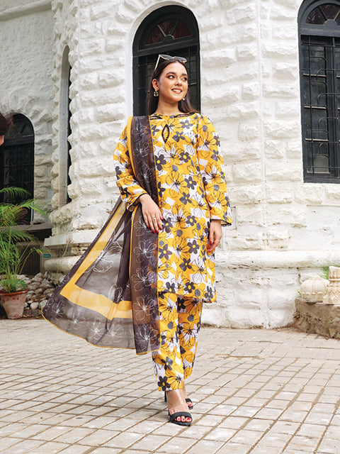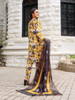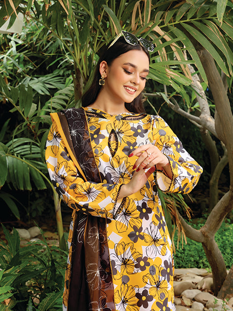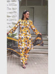 Discover Epiphany. Swiss Lawn with a yellow base, black and white flowers, and lace on the sleeves border. Paired with a premium chiffon contrast floral dupatta. Perfect for a chic summer outfit!