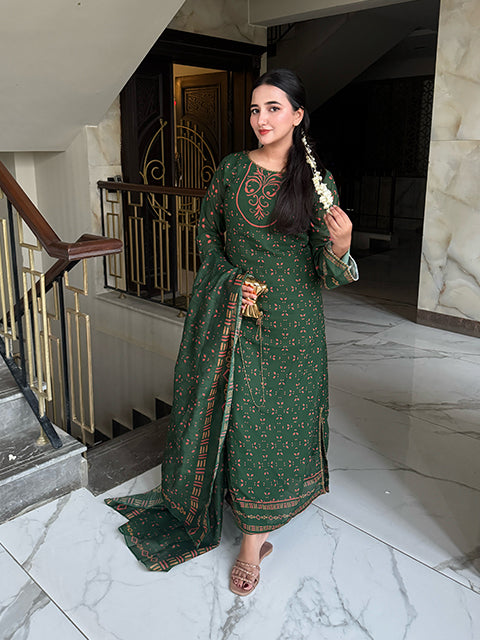 This elegant long shirt dress in a refreshing green hue embodies timeless grace and modern sophistication. Crafted from premium fabric, the shirt features a flowing silhouette that drapes beautifully, enhancing both comfort and style. Delicate embroidery and subtle detailing add a refined charm, while the matching trouser ensures a sleek and polished look. Paired with a lightweight dupatta that completes the ensemble, this outfit is perfect for semi-formal gatherings, festive occasions, or daytime celebrations. The serene green tone symbolizes freshness