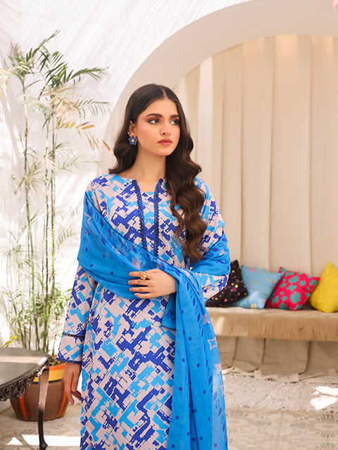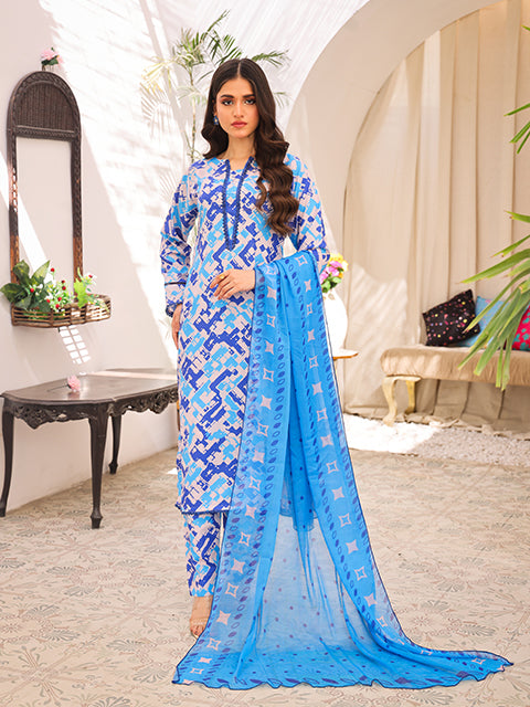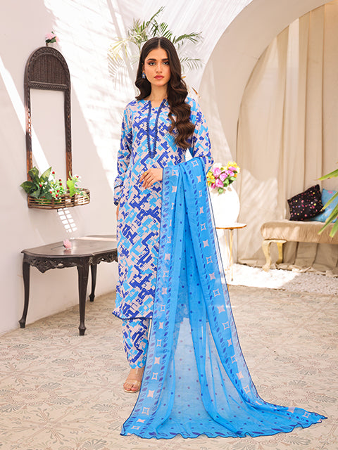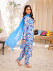 Impermanent Mirage Swiss Lawn with a sky blue base, overall floral print, printed shirt and a soft Chiffon dupatta with a blye base and floral prints. Perfect for a radiant and cheerful look!