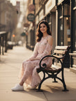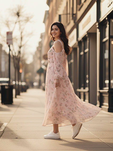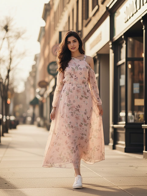 This is an elegant, full-length dress crafted from a lightweight floral chiffon fabric. The sheer nature of the chiffon, now rendered opaque to meet your needs, allows the dress to flow gracefully in the tropical breeze, giving it a soft, ethereal movement. It features a delicate pastel floral print and a flattering A-line or flowing maxi silhouette with full sleeves, making it perfect for a beach vacation, a resort evening, or a summer garden party. The dress embodies a romantic, breezy, and effortlessly chic aesthetic.