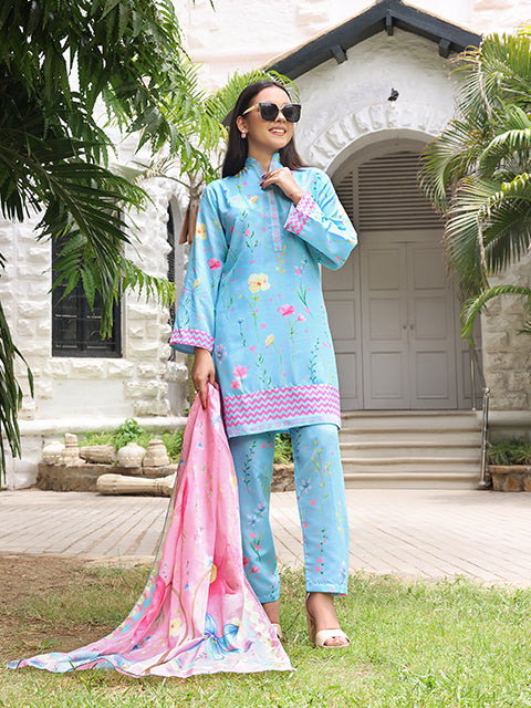 Discover Loquacious: Swiss Lawn with a light blue base, overall pink and yellow floral print, printed pink shirt border, and a soft silk dupatta with a pink base and floral prints. Ideal for a charming and delightful outfit!