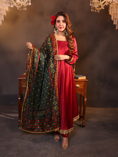 It is timeless three-piece silk outfit featuring a classic maroon with traditional print dupatta. The luxurious fabric is adorned with intricate embroidery and heavy lace detailing, adding a touch of opulence. Paired with tailored trousers and a beautifully embellished dupatta, this ensemble exudes grace and sophistication for any special occasion.