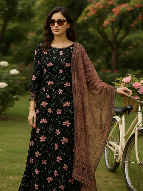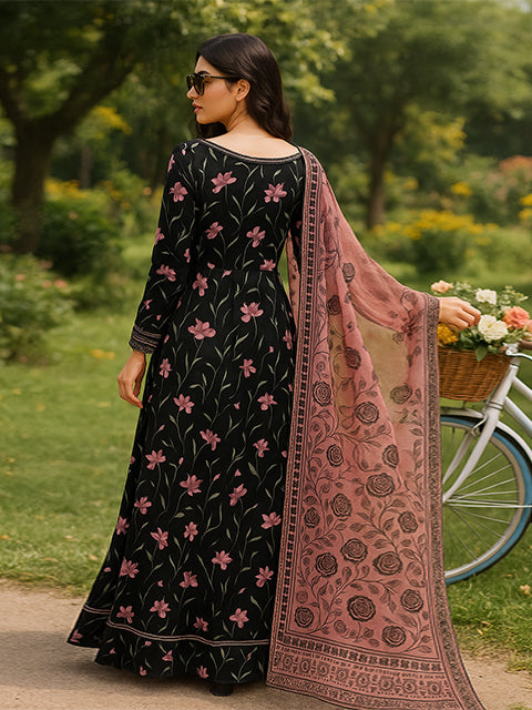 Highlighting its deep black backdrop and delicate pink florals, the look conjures the enchantment of blossoms unfurling beneath a starlit sky.