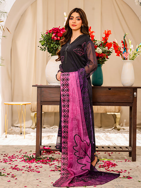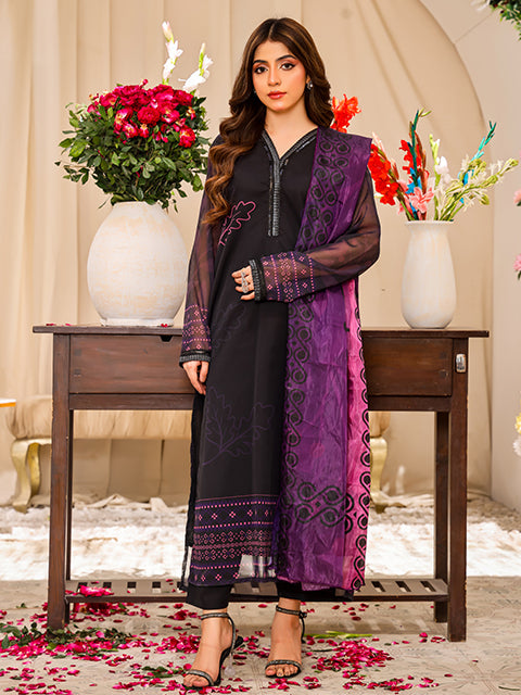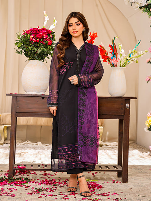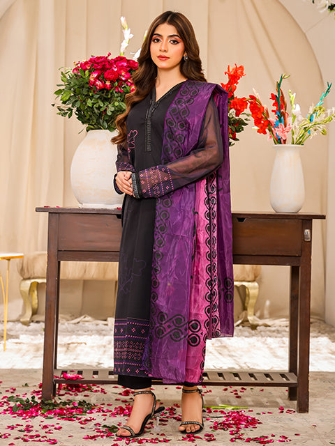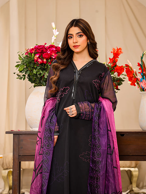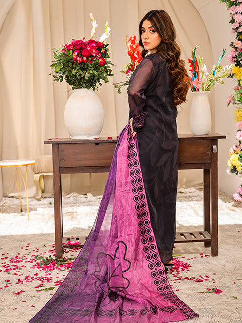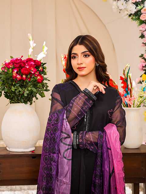This elegant black and purple shirt is adorned with intricate prints along the border and neckline, exuding a regal charm. Delicate lace on the neckline and sleeves adds a touch of refinement, while the matching purple dupatta enhances its graceful appeal. “Minuit Violet” captures the mystique of a midnight bloom.