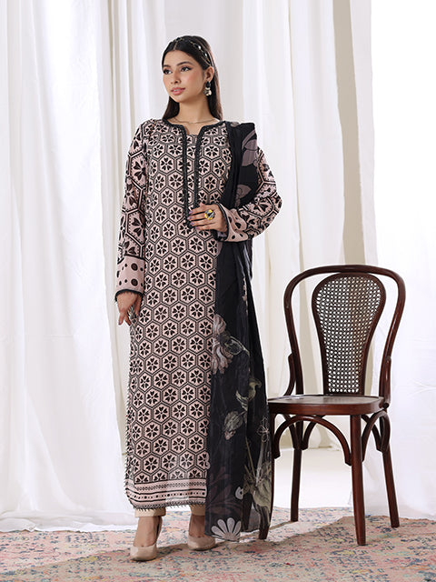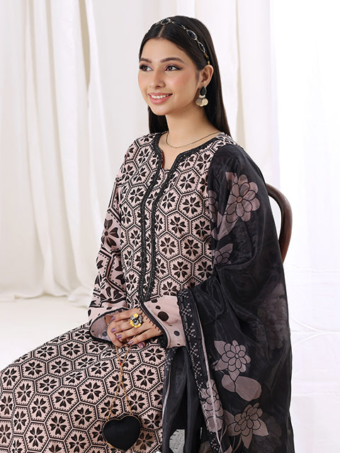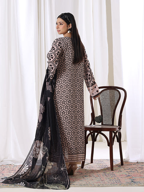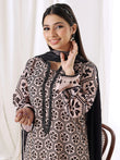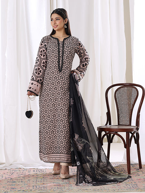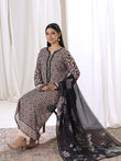 Embrace timeless charm with Monochrome Mosaic Grace, a striking ensemble that blends classic patterns with modern elegance. The long shirt features an all-over geometric motif in soft neutral tones, beautifully contrasted with intricate detailing along the neckline and cuffs. Designed to flatter with its clean, straight silhouette, it is paired with matching trousers for a refined finish. The look is completed with a sheer black dupatta adorned with subtle floral accents, adding depth and sophistication. Perfect for formal gatherings, evening events, or elegant daywear, this outfit exudes effortless poise and contemporary style.