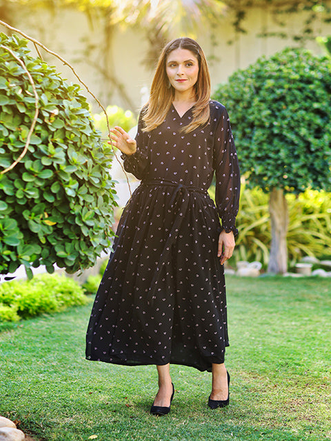 The simplicity of the design elevated by the subtle sparkle-like print makes it perfect for evening dinners, semi-formal occasions, or casual night events.