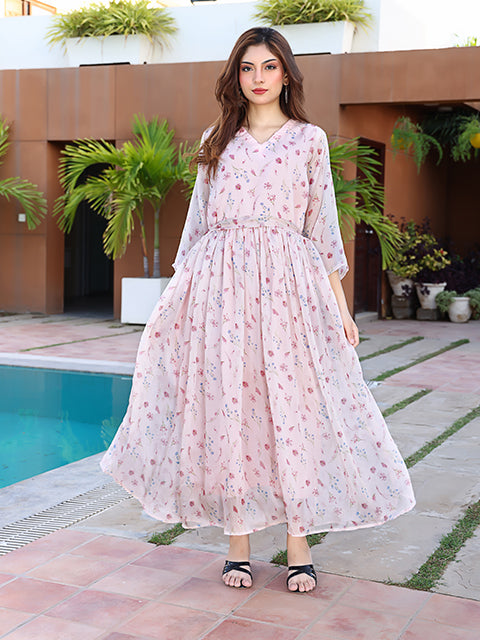 V-neck maxi frock with a defined waistline and ruffled hem, giving both structure and flow