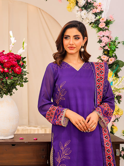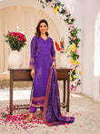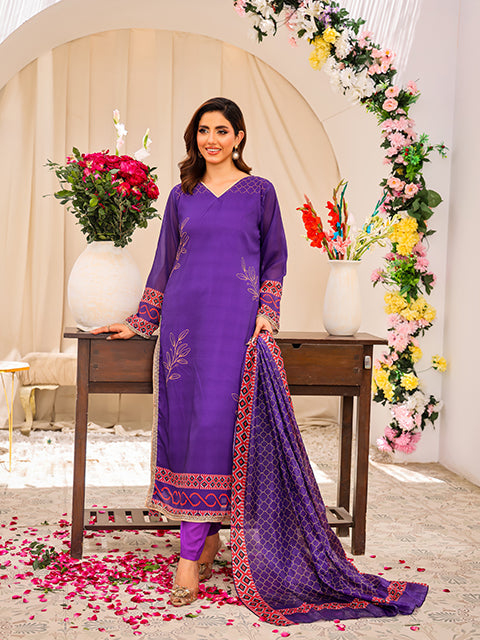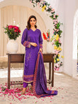 This elegant purple-pink shirt features intricate prints on the neckline and front border, complemented by a delicate lace neckline. The sleeves are adorned with a refined border, while the fully printed dupatta adds a statement touch. “Orchidée Royale” exudes regal charm and timeless grace.