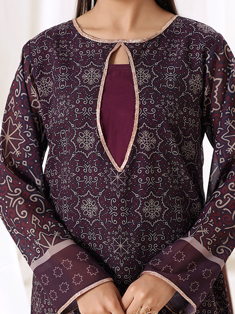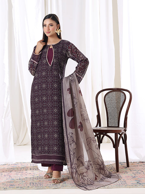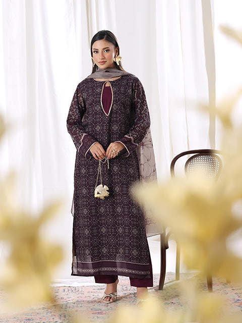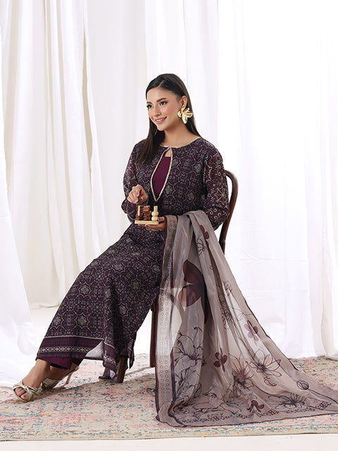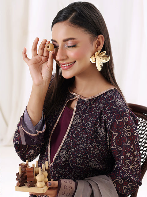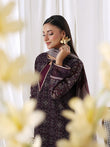 Indulge in classic sophistication with Plum Noir Elegance, a beautifully crafted ensemble in a rich plum hue. The long shirt is adorned with intricate all-over motifs that add depth and timeless charm, while the elegant slit neckline brings a modern, refined touch. Paired with matching trousers for a sleek silhouette, the look is completed with a soft, sheer dupatta featuring subtle floral accents that flow gracefully. Ideal for evening gatherings, festive occasions, or formal wear, this outfit exudes poise, elegance, and effortless style.