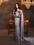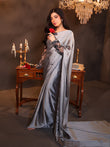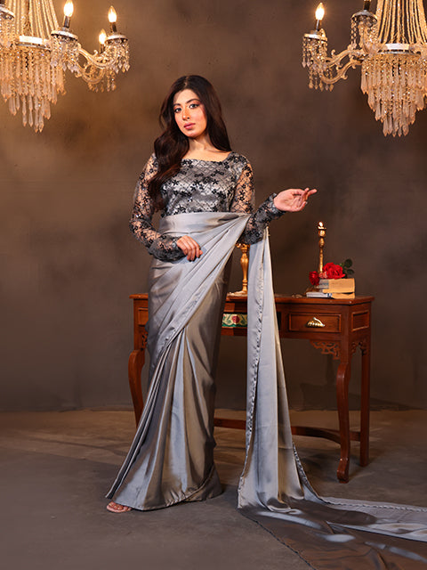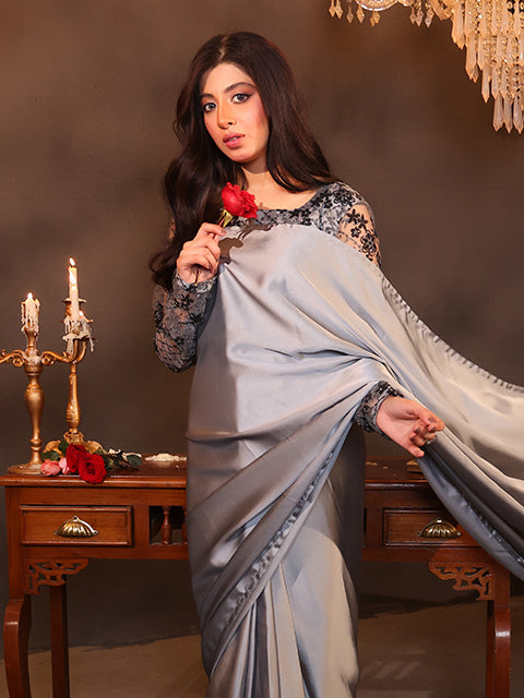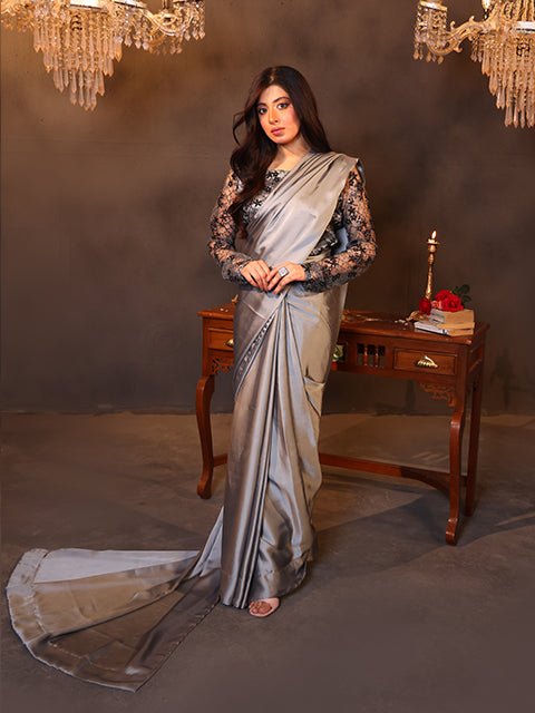 This luxurious silk saree exudes timeless elegance with its rich, lustrous fabric that drapes beautifully, enhancing every movement with grace. The smooth texture and natural sheen of silk add a royal charm, making it a statement of sophistication. Paired with a delicately embroidered net blouse, it strikes a perfect balance between tradition and modern allure. The sheer net fabric adds a touch of mystique, completing this exquisite ensemble with grace and poise.