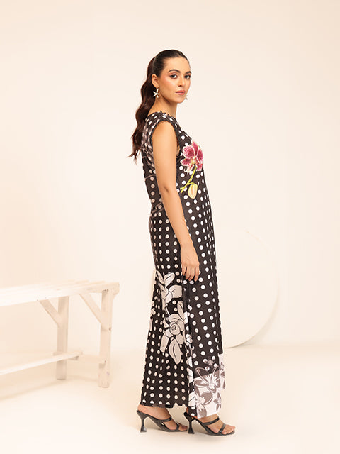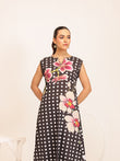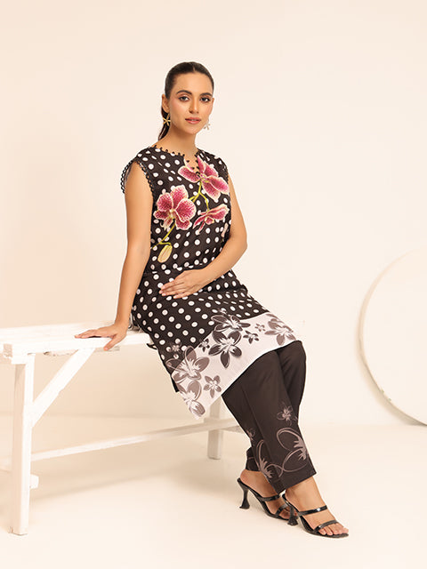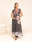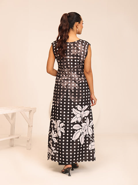 Introducing our black polka print with floral, a graceful print of understated beauty and timeless style. Crafted from sumptuous soft crepe fabric, this enchanting ensemble showcases a mesmerizing floral print in.