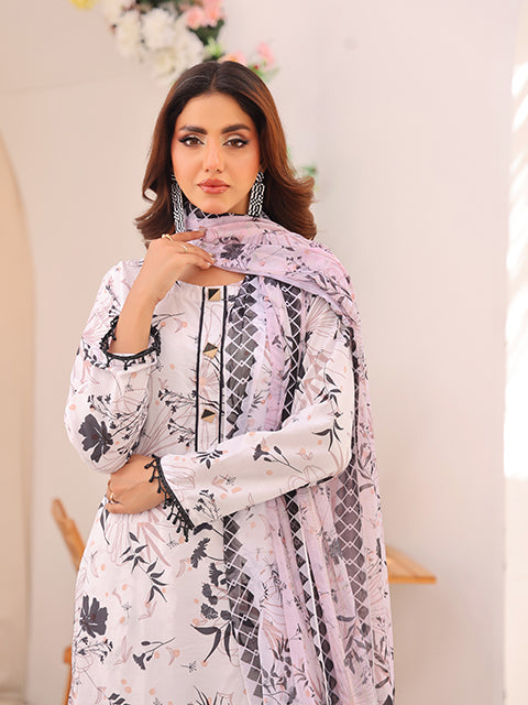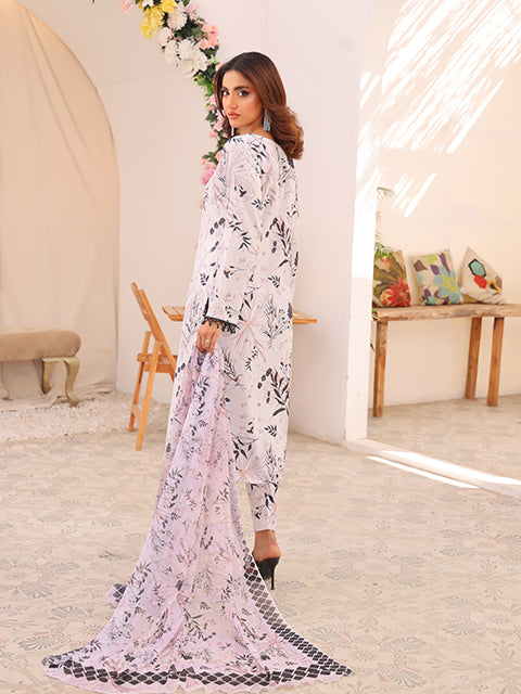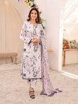 Discover Stellar Vision. Swiss Lawn with a white base, floral prints, and petal-detailed trousers. Paired with a soft silk dupatta with colorful floral borders. Perfect for a stunning summer look!