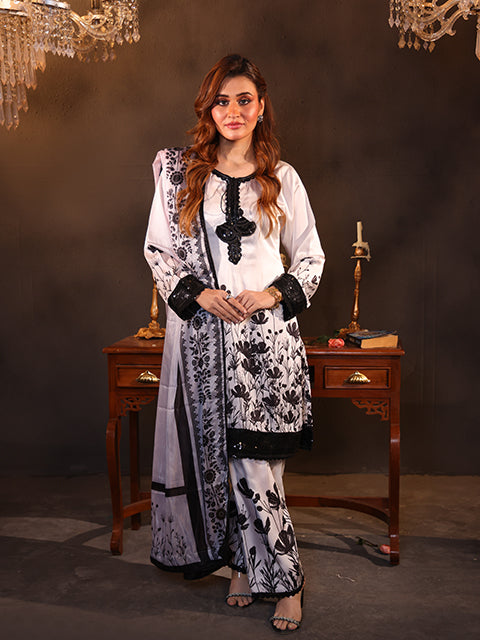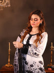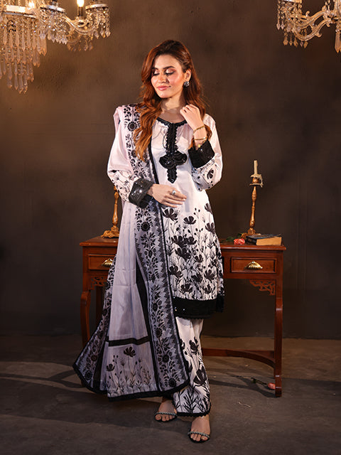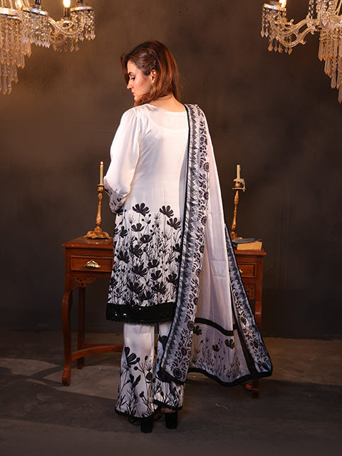 The Ivory Noir Ensemble is a sophisticated three-piece silk dress featuring a black and white floral print. The short shirt is adorned with delicate sequin lace, adding a subtle shimmer, while the loose pants offer effortless elegance. A complementing dupatta completes the ensemble, making it perfect for chic and upcoming Eid festive.
