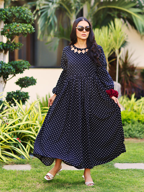 Its light and airy fabric paired with subtle floral patterns makes it ideal for daytime gatherings, garden parties, or festive wear