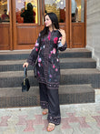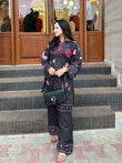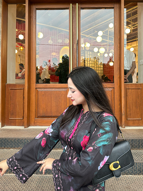 The deep dark base paired with vibrant floral patterns creates a look that is both elegant and full of life.