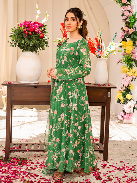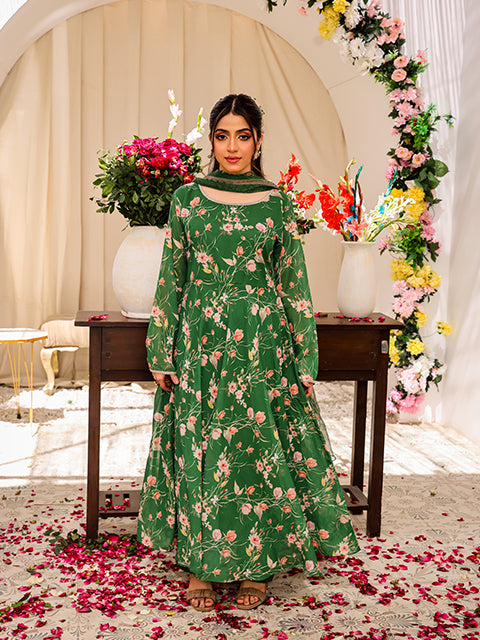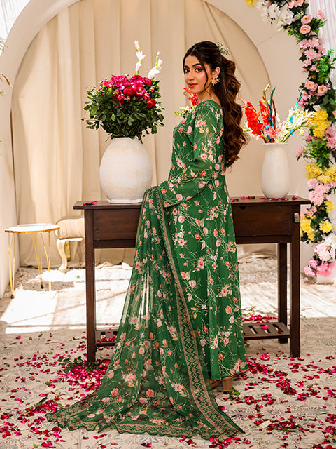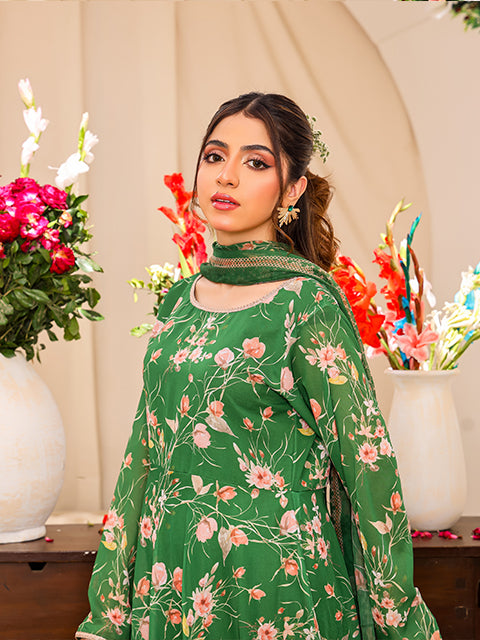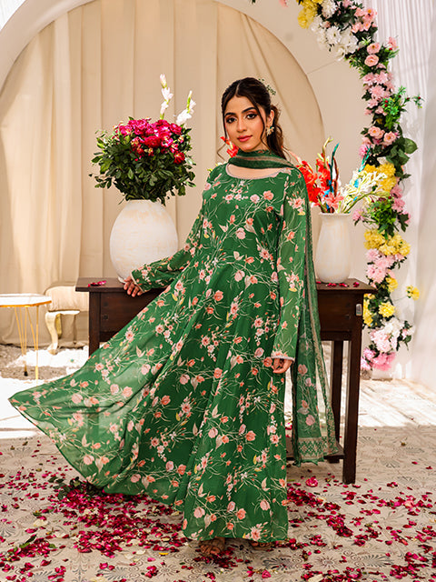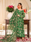 This enchanting green frock features a delicate floral print that evokes the beauty of a blooming garden. With lace adorning the neckline and a flowing dupatta, it exudes grace and freshness. “Verte Floraison” captures the essence of nature’s elegance in every detail.